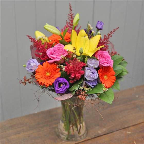 A petite hand tied bouquet in mixed vibrant colours including lilies, roses, mini gerberas, astilbe and lisianthus presented in a glass vase.